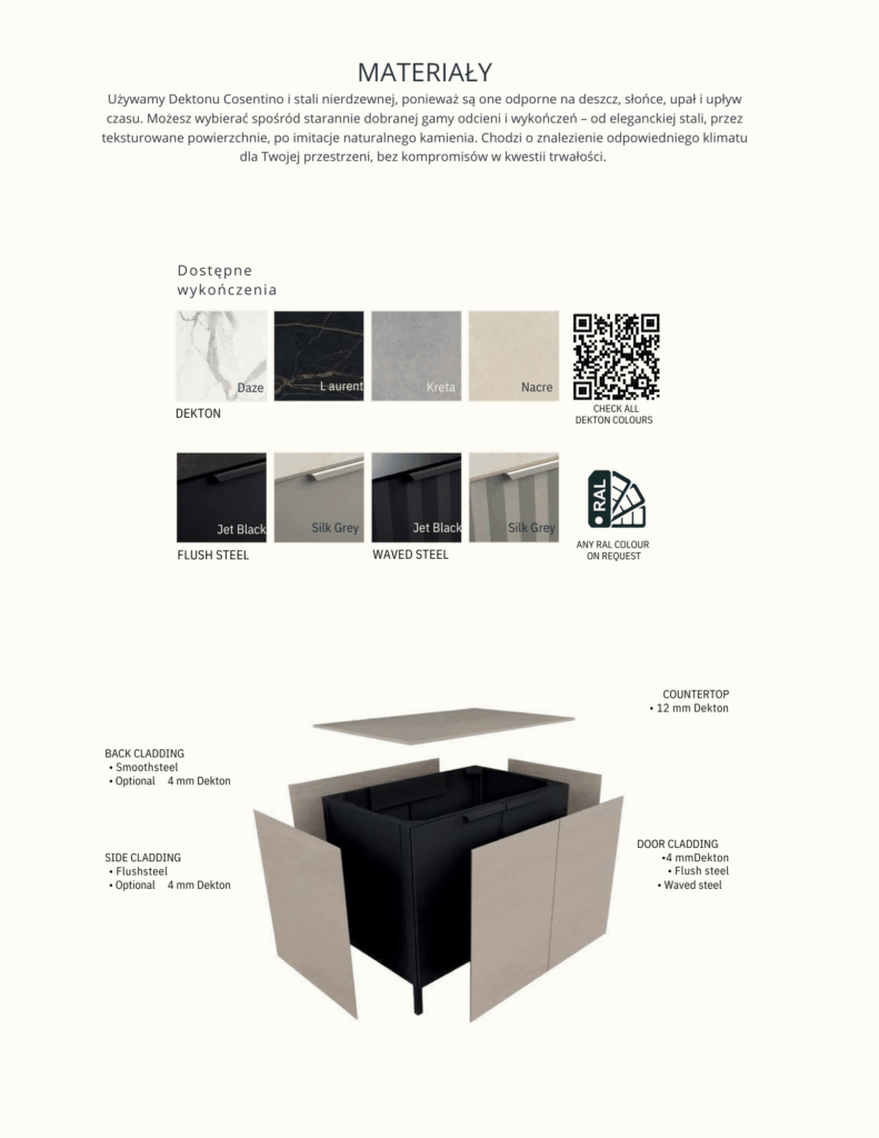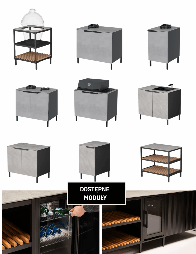 - Dowolna konfiguracja – od kompaktowej kuchni na balkon, po rozbudowaną strefę gotowania z grillem, zlewem, szafkami, paleniskami i stołem roboczym.